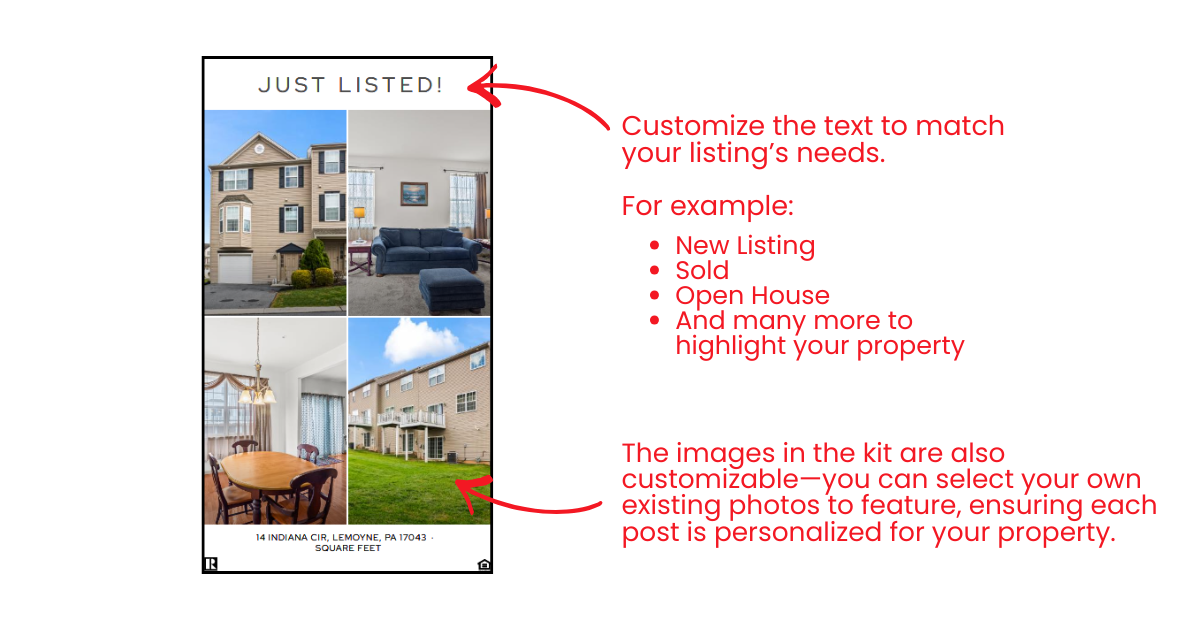 Each graphic is optimized for mobile viewing and designed to complement professional real estate photography, ensuring listings look polished and cohesive wherever they appear online.